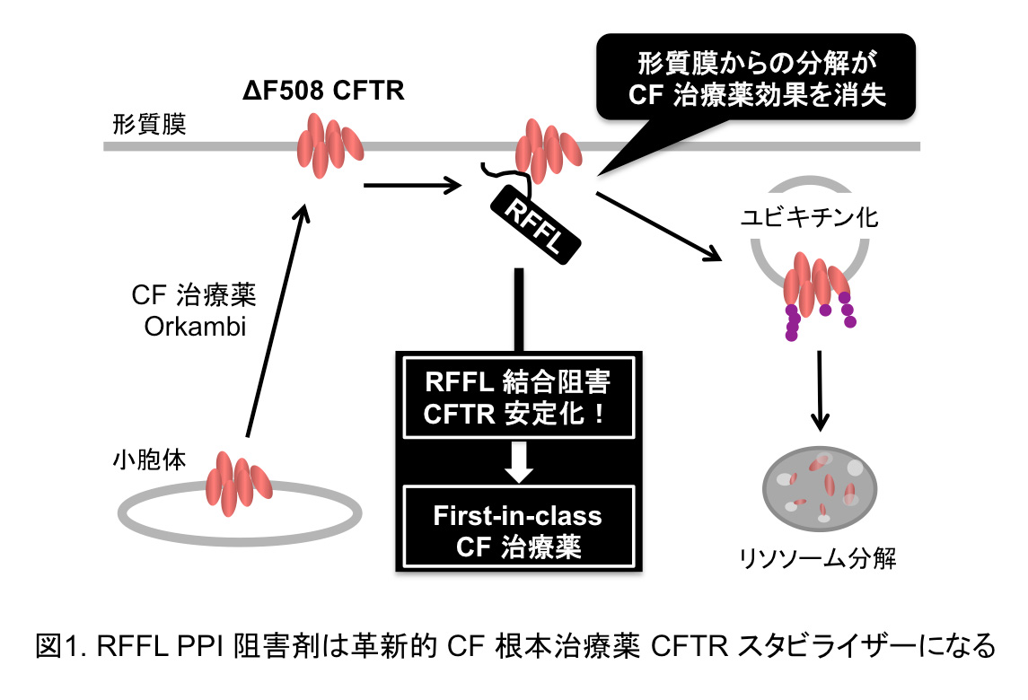 嚢胞性線維症(Cystic Fibrosis; CF)は呼吸器系を侵す単一遺伝病で、世界に8万人の患者が存在する指定難病です(平均寿命40歳)。CFの原因は、形質膜の塩素イオンチャネル CFTR の遺伝子変異(ΔF508 変異)に起因した CFTR タンパク質の形質膜発現低下で、近年、ΔF508 CFTR の形質膜移行を促進する CF治療薬(Orkambi🄬)が上市されましたが、その治療効果が非常に弱く、有効な CF 薬物療法の確立には形質膜で CFTR を安定化する CFTR スタビライザーの開発が望まれています。